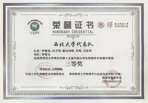 由中国大学生物理学术竞赛组委会、教育部物理学育人模式改革虚拟教研室主办,陕西师范大学、陕西省物理学会共同承办的第十五届中国大学生物理学术竞赛(China Undergraduate Physics Tournament,以下简称CUPT)于8月18日-23日在陕西师范大学成功举办。来自全国近百所高校的800余名师生参加本届大赛。我校代表队最终获得全国三等奖。