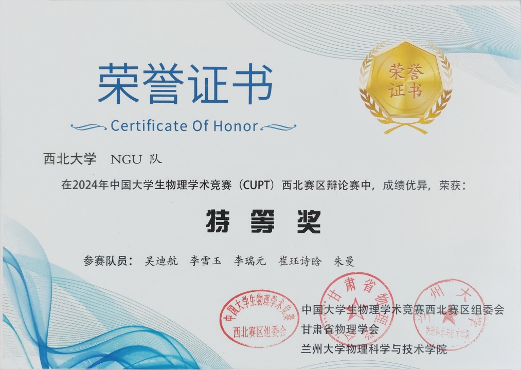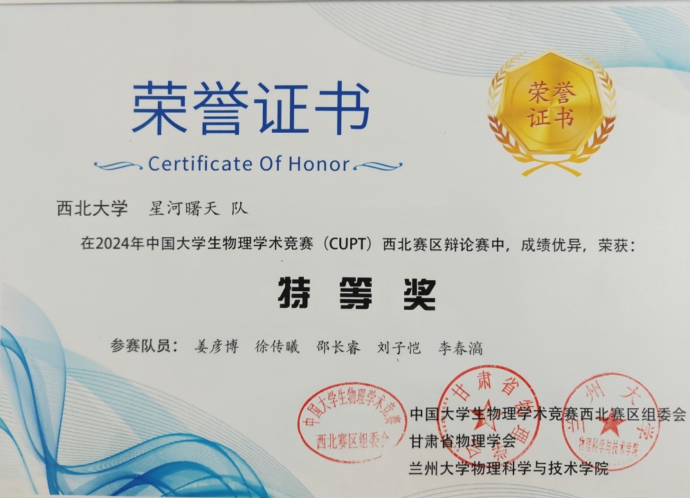 2024年大学生物理学术竞赛陕西省赛于5月24-25日在咸阳师范学院举行, 比赛形式为线上竞赛。我校派出十二名同学参赛,经过一天十二轮次的比赛,最终取得特等奖2项、一等奖9项(个人奖)的好成绩。西北地区赛于6月8-9日在兰州大学举行,比赛仍为线上形式,我校组织三支代表队共15名学生,6名辅导教师(兼裁判)参赛。经过两天半的比赛,获得2项特等奖和1项一等奖的好成绩,同时取得全国赛参赛资格。