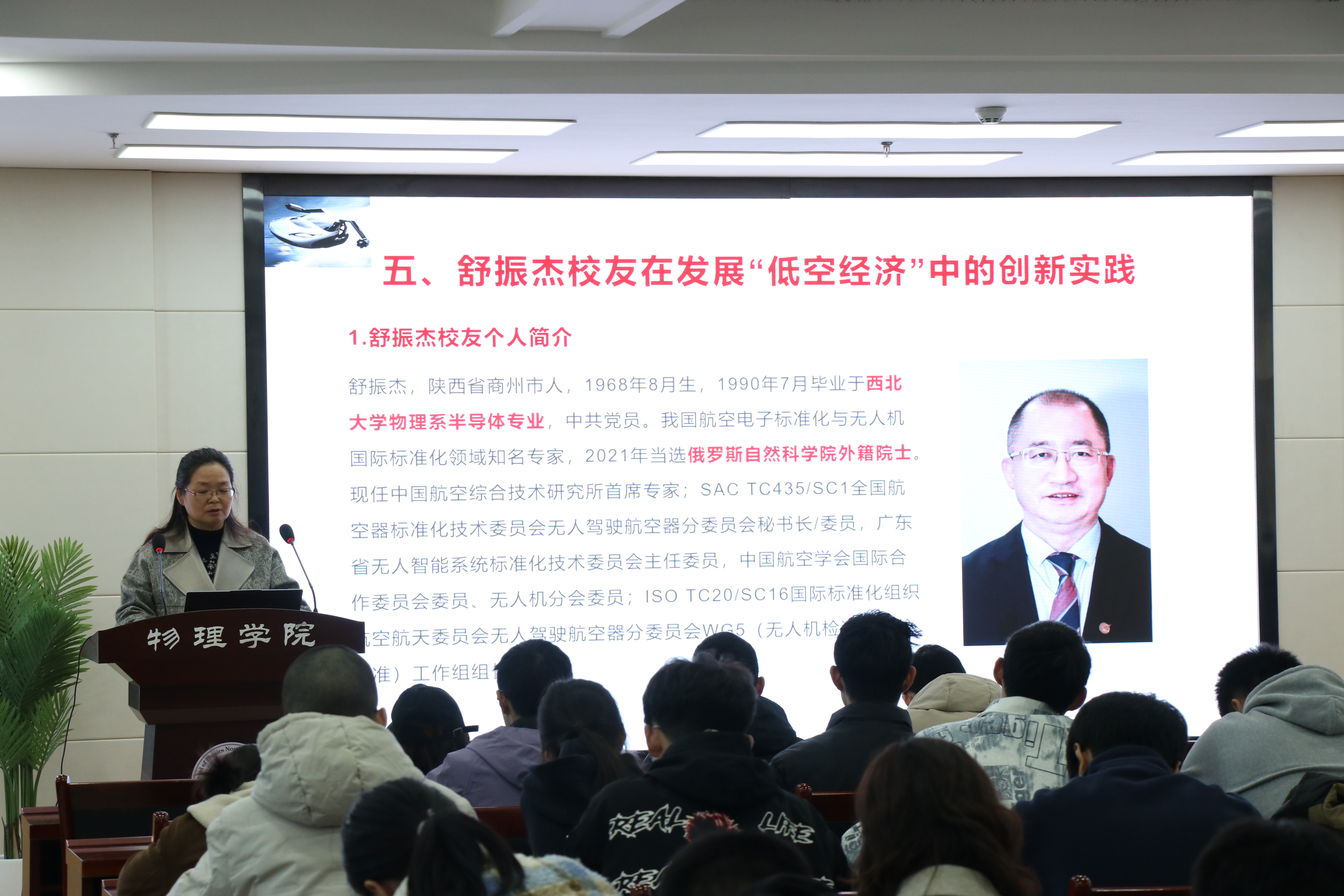 最后,张军丽老师通过两个总结思考问题结束了本次思政课。她强调,同学们应通过对新质生产力之低空经济的学习,树立系统思维、创新意识,及时掌握国家经济发展的新形态、新业态。通过学习优秀校友舒振杰院士在低空经济方面的创新实践活动,进一步增强对物理学科的专业认知,做好基础知识的积淀及融会贯通训练,为未来参与国家经济建设和科技创新奠定思想基础,培养积极应对挑战、勇于创新实践的精神,努力提升自身能力,为宽领域科技报国储能备力。