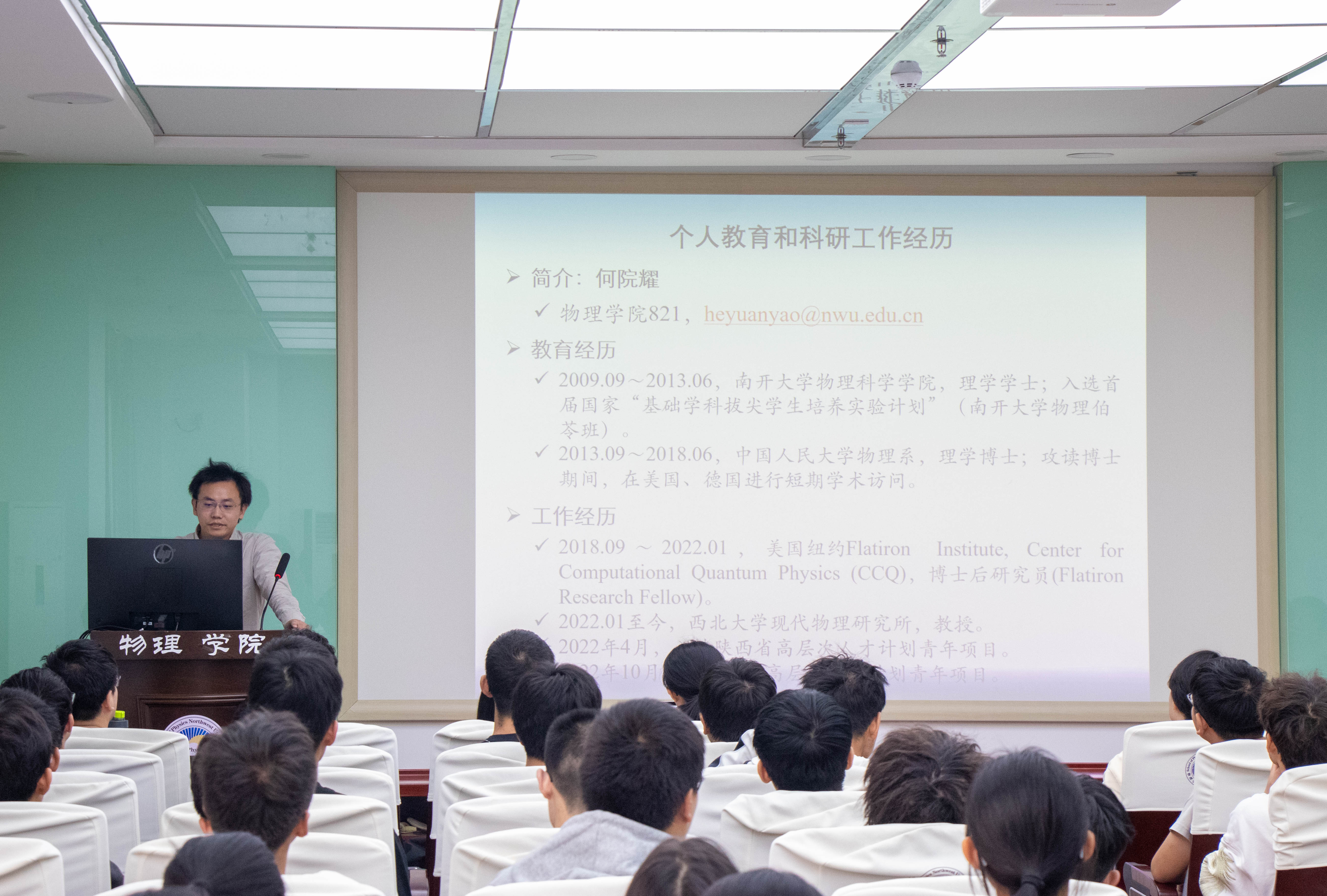 10月10日中午,何院耀教授开展了题为“学习科研交流会”的讲座。他在讲座中首先介绍了自己的工作经历,而后就强关联下量子多体体系进行重点说明,先简要介绍何种情况算是强关联,接着又举出一些和强关联有关的效应及说明理论运算的困难之处,再进一步,阐明数值计算的必要性以及如何进行强关联体系的数值计算,例如利用量子蒙特卡洛算法。最后也给同学们提了些学习及科研训练上的建议。此次讲座让同学初步领略强关联系统的美丽之处,及对计算物理这一大方向有了基本概念,且对日后学习有了更加明确的方向。