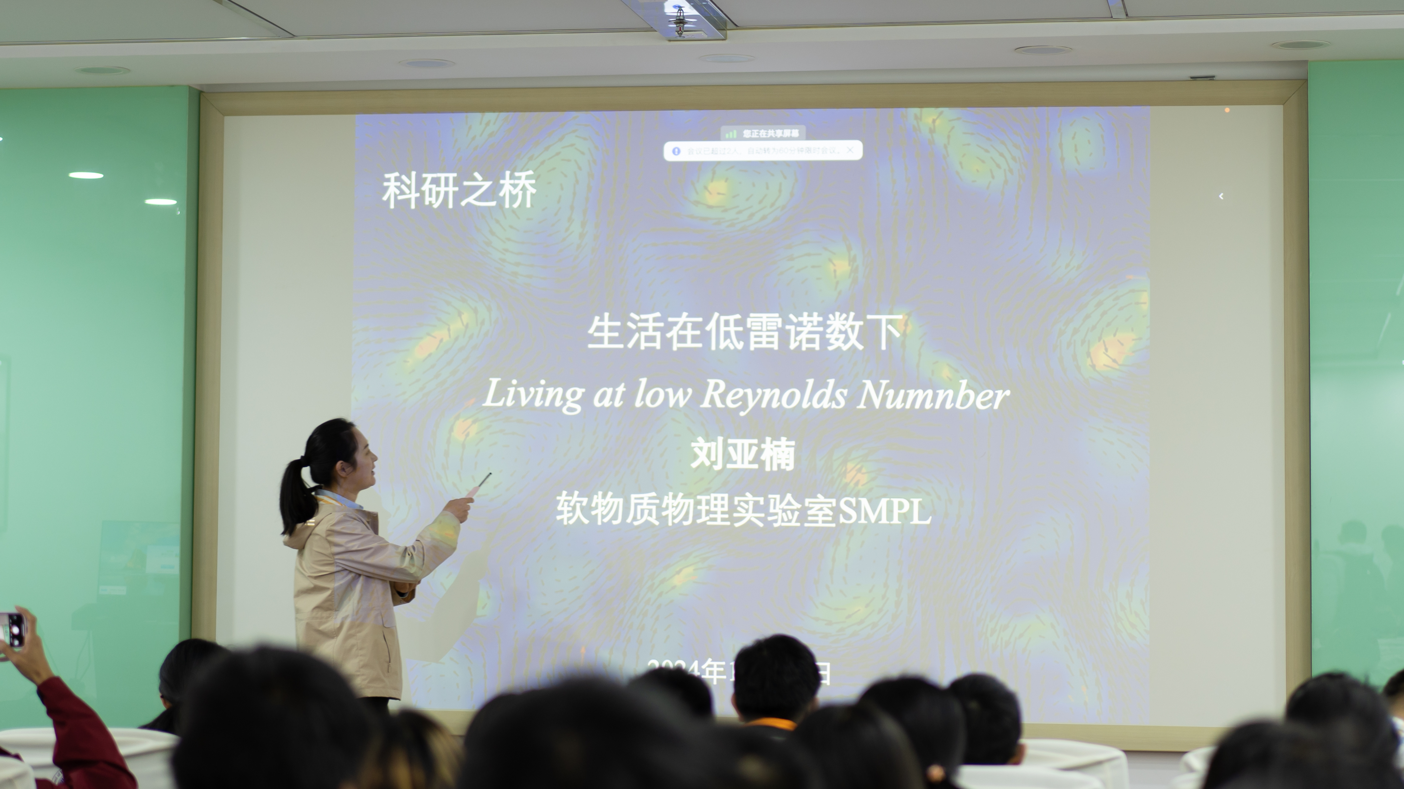 10月25日中午,刘亚楠教授开展了题为“生活在低雷诺数下”的讲座。她在讲座中讲述了流体力学发展过程中多位科学家的重要工作,简单解释了一些与流体相关的基本概念。其次,通过丰富多彩的图片和视频形象地展示了低雷诺数下流体的性质,并详细说明了生活在其中的生物如何克服流动的可逆性并实现较为自由的运动。然后,又阐明了流体在界面处的一些行为。最后,她介绍了自己所在课题组的相关情况以及工作内容,并对想要加入的同学们表示欢迎。此次讲座刘亚楠老师用形象生动的比喻向同学们描绘了低雷诺数下的世界,也让同学们了解到与软物质和凝聚态相关的内容,使同学们深刻体会了该方向学科交叉的特点。