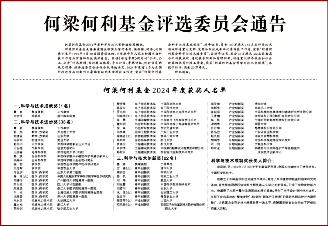 何梁何利基金由香港爱国金融家何善衡、梁銶琚、何添、利国伟于1994年创立,旨在奖励中国杰出科学家,服务国家现代化建设。30年来,共遴选奖励1638位杰出科技工作者,成为我国社会力量创设科技奖项的成功范例,为激发我国科技发展的活力、培养自主创新人才发挥了积极作用。2024年度,全国共有56位杰出科技工作者获奖,其中“何梁何利基金科学与技术成就奖”1人,“何梁何利基金科学与技术进步奖”33人,“何梁何利基金科学与技术创新奖”22人。