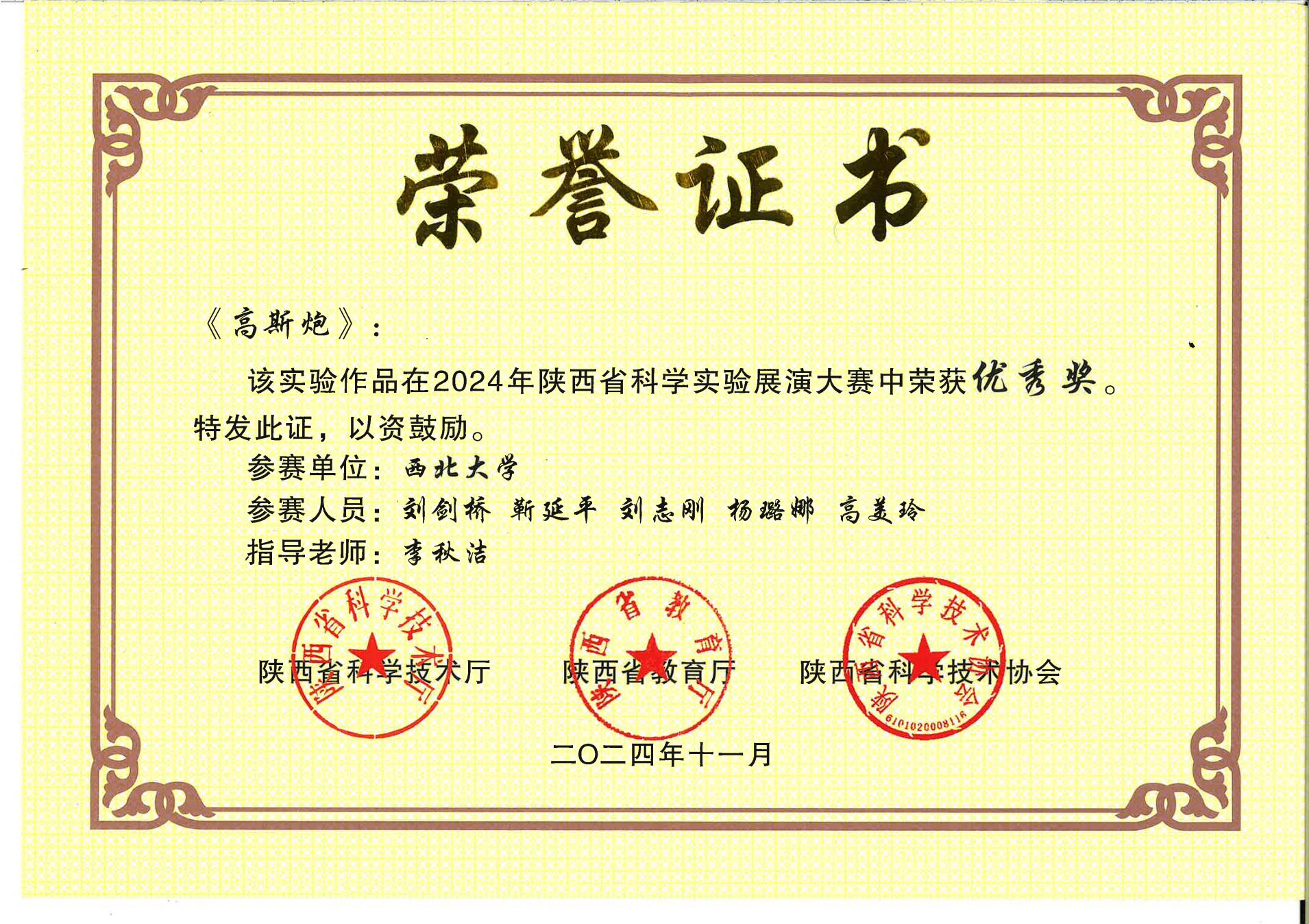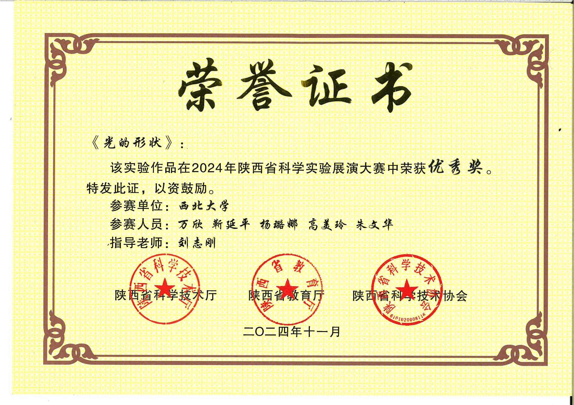 陕西省科学实验展演大赛获奖证书