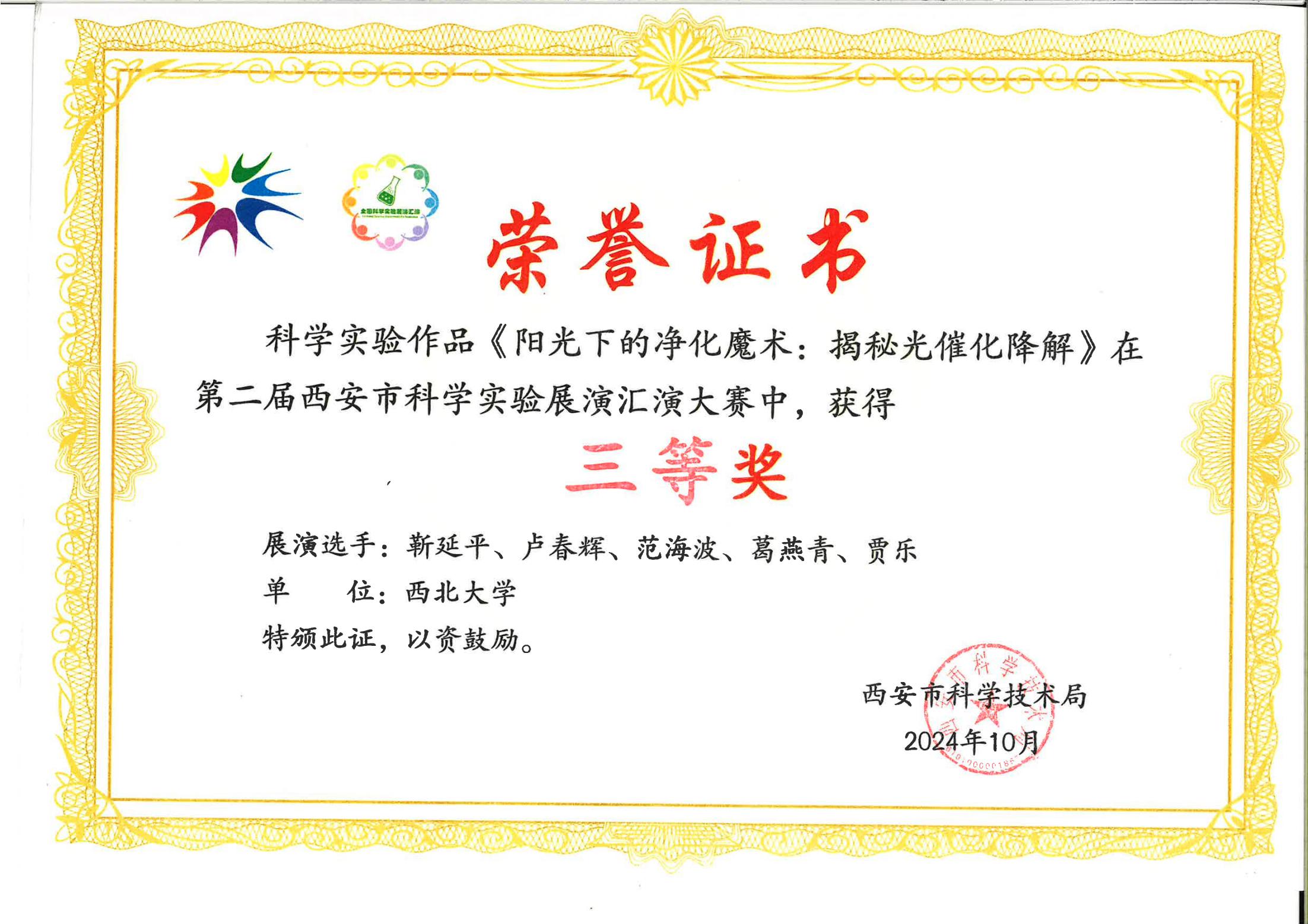 同时,在西安市科学技术局公布的第二届西安市科学实验展演大赛获奖名单中,靳延平老师及团队作品《阳光下的净化魔术:揭秘光催化降解》荣获三等奖。团队用灵巧奇妙的实验操作、生动形象的故事演绎、惟妙惟肖的角色扮演等表现形式,深入浅出地完成演绎,集科学性、知识性、趣味性、观赏性于一体,获得评委老师的一致认可。