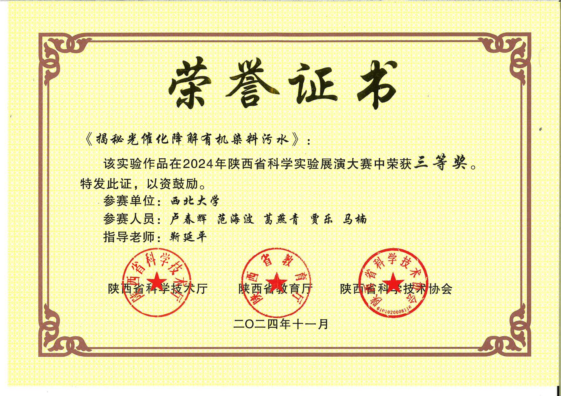 近日,2024年陕西省科学实验展演大赛获奖名单公布,必赢靳延平老师指导的作品《揭秘光催化降解有机染料污水》获得三等奖,李秋洁老师指导的作品《高斯炮》和刘志刚老师指导的作品《光的形状》均获得优秀奖。