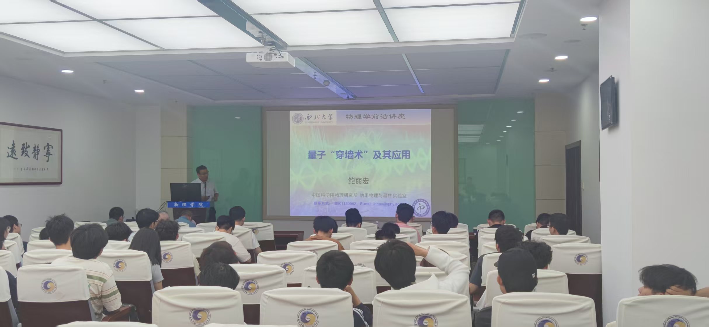 鲍丽宏研究员作了题为“量子‘穿墙术’及其应用”的学术讲座,以生动形象的故事引入量子“穿墙术”的本质——物理学中的量子隧道效应。这是一种量子特性,是光子、电子等微观粒子,能够穿过它们本来无法通过的“墙壁”的特殊现象。自从量子隧道效应发现以来,应用于许多重要的领域,例如扫描隧道显微镜的发明、半导体和超导体中隧道效应等。报告中介绍鲍丽宏研究员研究组近年来在利用扫描隧道显微镜研究低维纳米体系中的特殊效应、超导体等强关联体系中的电子态的新奇物性、以及基于量子隧道效应构筑低维电子器件方面的进展。