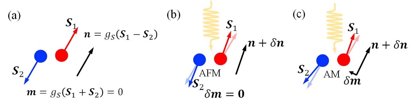 图1 (a)本征状态以及光照下(b)常规反铁磁(c)交错磁自旋扭转隐藏模式示意图。