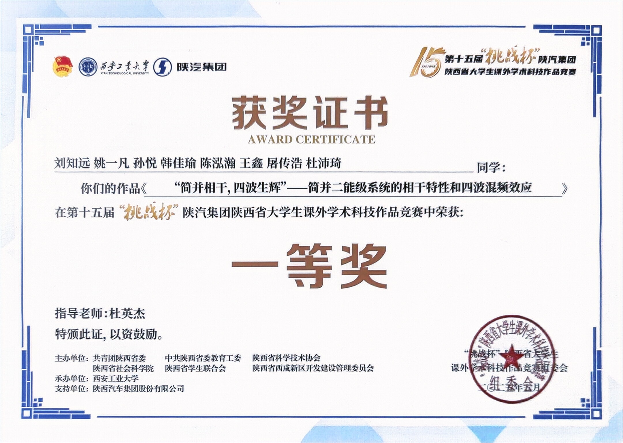 必赢积极响应学校通知要求,经过前期组织报名、学院打磨、学校推荐,由杜英杰老师指导、必赢本科不同专业同学合作完成的参赛作品《“简并相干,四波生辉”——简并二能级系统的相干特性和四波混频效应》荣获省级一等奖。