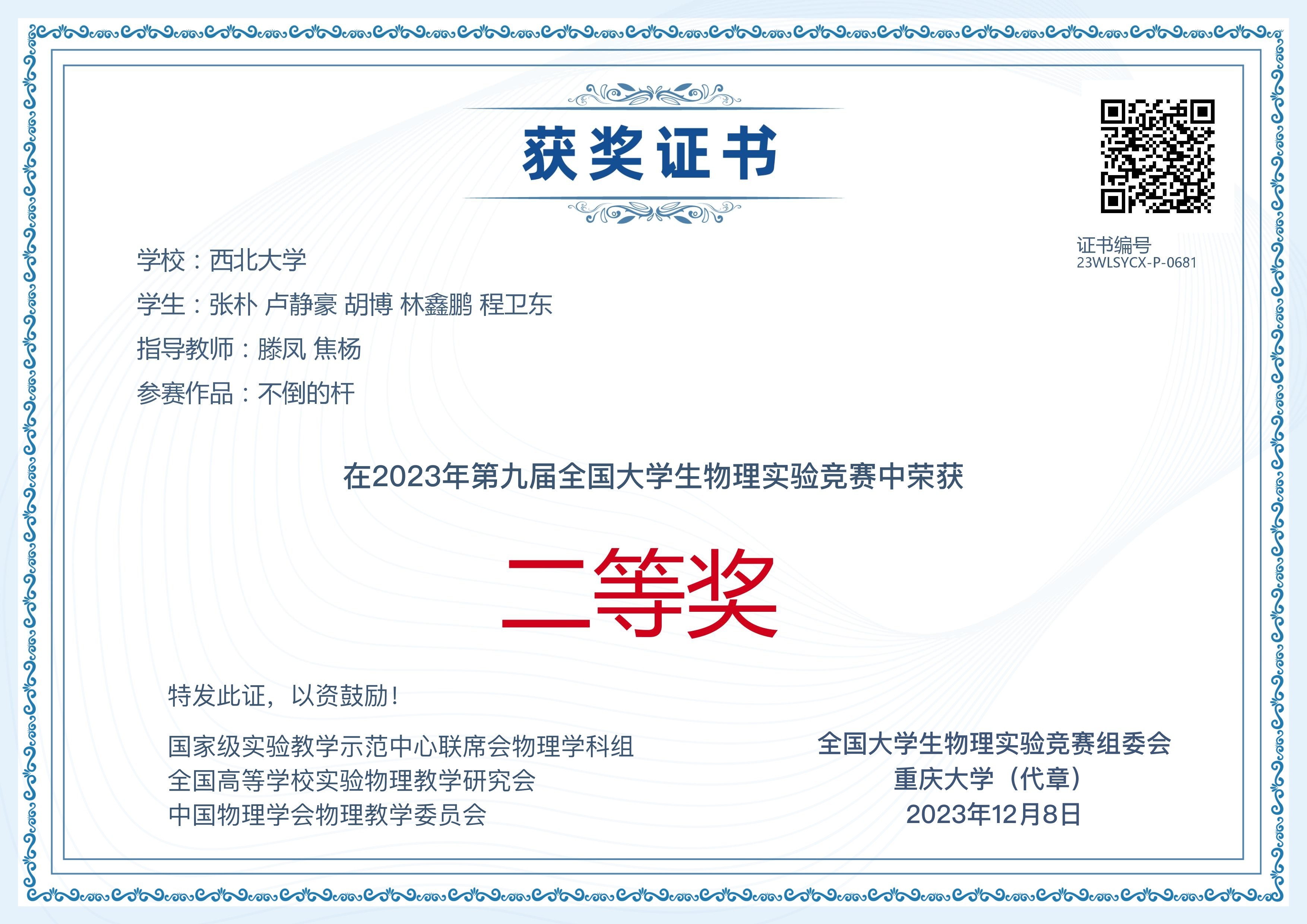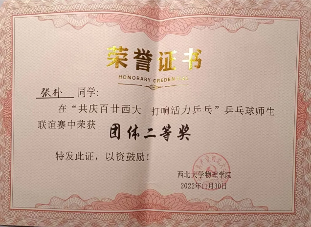 张朴的大学时光,远不止于课堂与实验室。他始终相信,真正的优秀,是学术与综合素质的双重卓越。从学科竞赛到文体活动,他始终以饱满的热情投入其中,在各类舞台上绽放光彩。他报名参加全国大学生物理实验竞赛,与团队成员反复优化实验方案,最终获得国家级二等奖。这次经历不仅提升了他的实验技能,更让他学会了如何在团队协作中高效沟通、分工配合。学习科研之余,张朴同样热爱运动与艺术,他是师生联谊赛“共庆百廿西大”乒乓球赛的活跃选手,在球桌上与老师们切磋技艺;也是“唱响新时代”2023年学生合唱比赛的成员,用歌声表达对母校的热爱。这些活动不仅丰富了他的课余生活,更让他在团队中收获了珍贵的友谊。