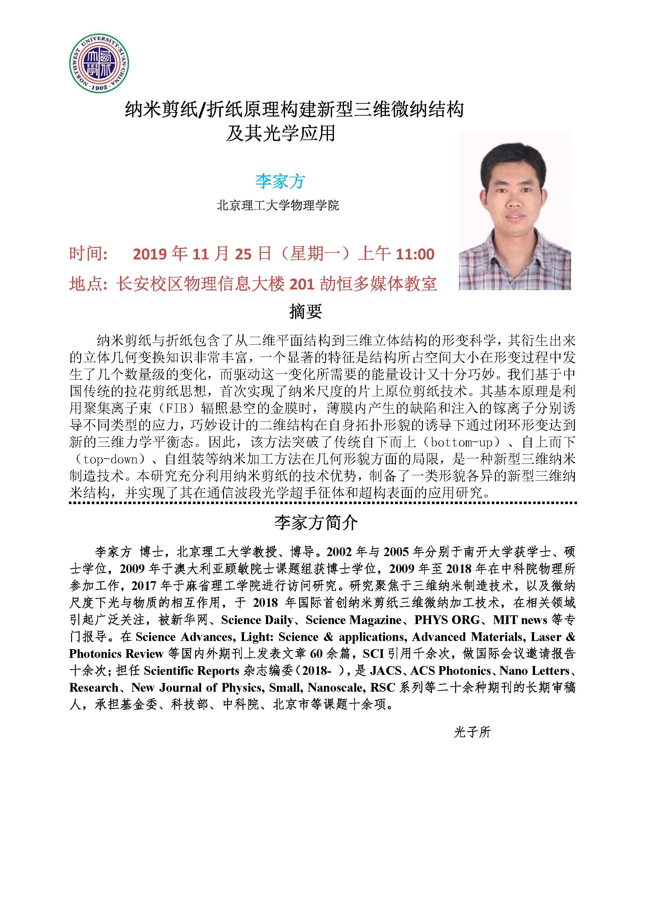 学术报告——纳米剪纸/折纸原理构建新型三维微纳结构及其光学应用