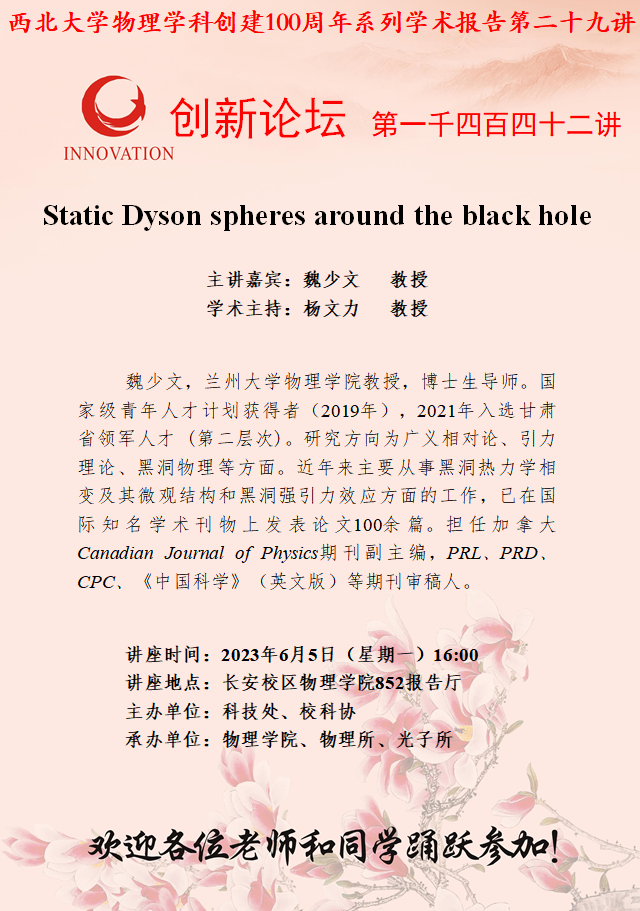 366net必赢官网创新论坛第一千四百四十二讲暨物理学科创建100周年系列学术报告第二十九讲:Static Dyson spheres around the black hole