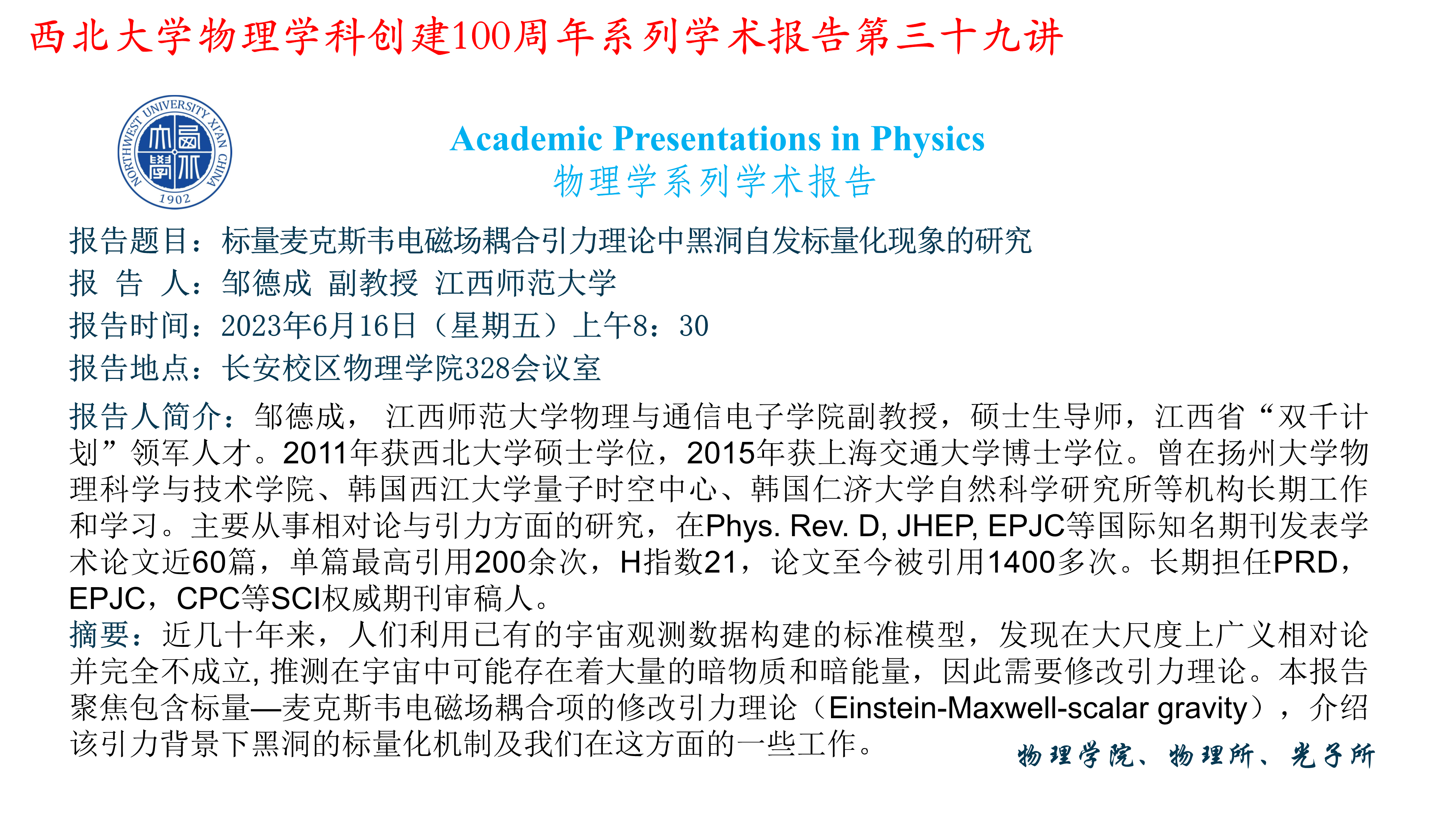 学术报告——标量麦克斯韦电磁场耦合引力理论中黑洞自发标量化现象的研究
