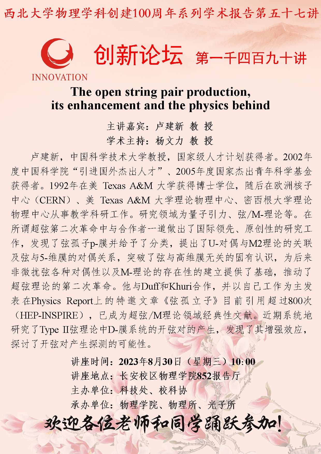366net必赢官网创新论坛第一千四百九十讲暨物理学科创建100周年系列学术报告第五十七讲:The open string pair production, its enhancement and the physics behind