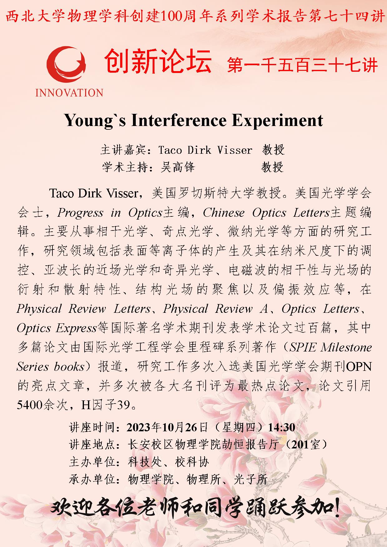 366net必赢官网创新论坛第一千五百三十七讲暨物理学科创建100周年系列学术报告第七十四讲:Young`s Interference Experiment