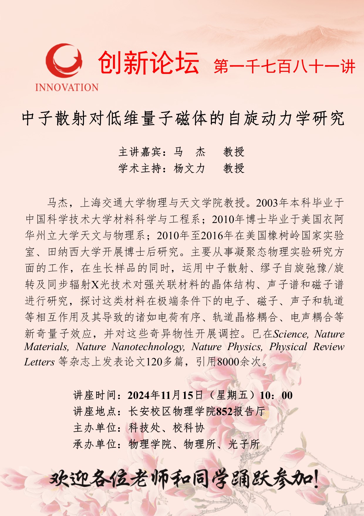 366net必赢官网创新论坛第一千七百八十一讲:中子散射对低维量子磁体的自旋动力学研究