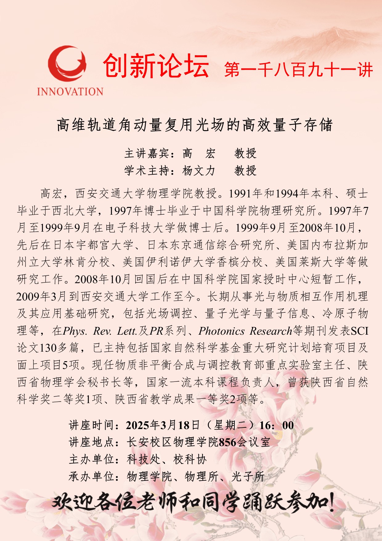 366net必赢官网创新论坛第一千八百九十一讲:高维轨道角动量复用光场的高效量子存储