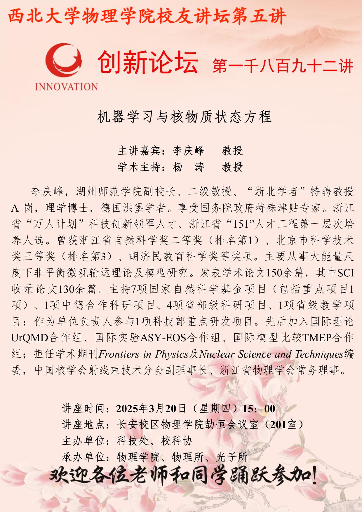 366net必赢官网创新论坛第一千八百九十二讲:机器学习与核物质状态方程