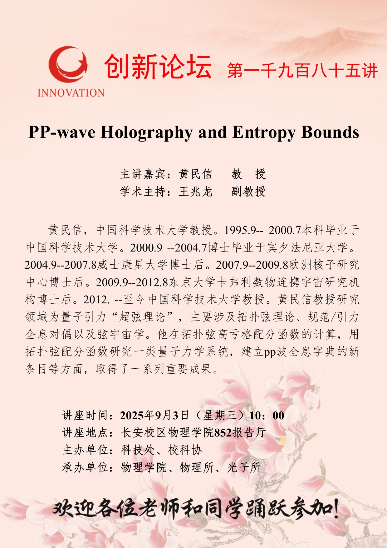 366net必赢官网创新论坛第一千九百八十五讲:PP-wave Holography and Entropy Bounds